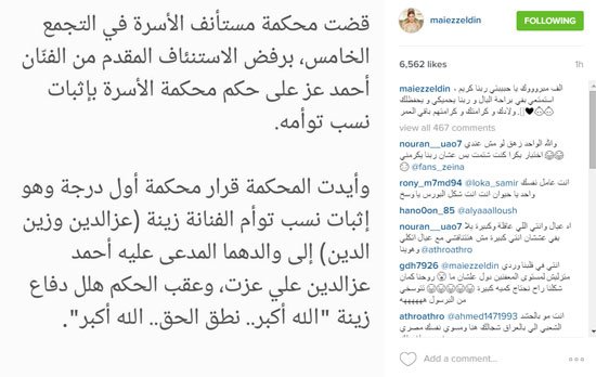 باركت الفنانة المصرية " مي عز الدين لمواطنتها الفنانة "زينة"، وذلك بعد أن رفضت محكمة الأسرة الاستئناف المقدم من أحمد عز بنسب توأمه.