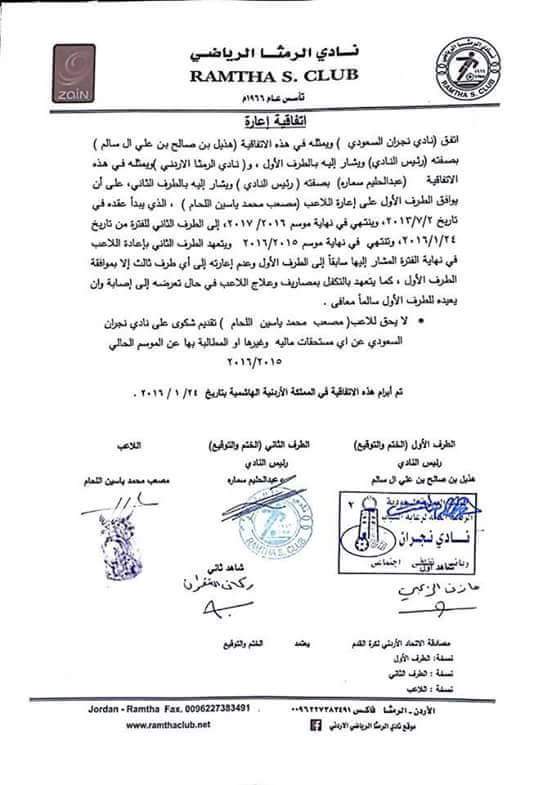 وافق نادي نجران السعودي رسمياً على اعارة لاعبه مصعب اللحام لفريق الرمثا لكرة القدم ليمثله حتى نهاية الموسم الحالي.