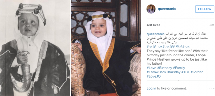 كتبت جلالة الملكة رانيا العبدالله على صفحتها الفيسبوكية "يقال إن الولد هو سر أبيه. مع اقتراب مناسبة عيد ميلاد شخصين عزيزين على قلبية أتمنى أن يكبر هاشم ليصبح مثل أبيه".