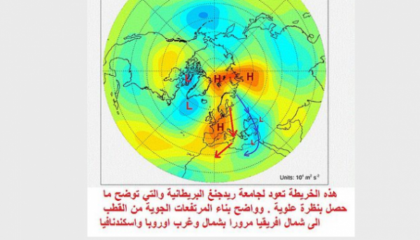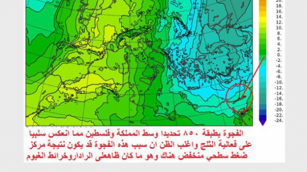 هذا من شأنه ان يسبب بعد مشيئة الله هبوط للهواء البارد على شرق المتوسط و التفافه ناحية مصر وليبيا مع حركة المرتفع هناك مما يقلل ولو نسبيا من كمية التبريد العلوي فوق شرق المتوسط والمملكة تحديدا وهذا ما حصل بالفعل وهو اقرب لتمدد عرضي . ونتيجة لذلك تتعدد الضغوط السطحية استجابة لهذا التمدد العرضي ناحية مصر وليبيا . وهنا تختلف معادلة الرياح والرطوبة والبرودة بطبقة 850 هيكتوباسكال تبعا لهذه المراكز السطحية المترامية هنا وهناك