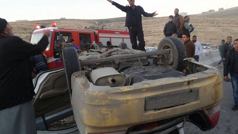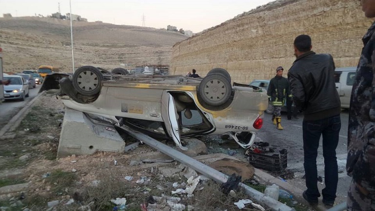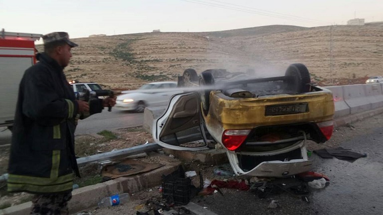 أصيب 5 أشخاص من عائلة واحدة بينهم 3 أطفال مساء الجمعة، اثر انقلاب السيارة التي كانوا يستقلونها على طريق ياجوز الواقع بين محافظة عمان والزرقاء .