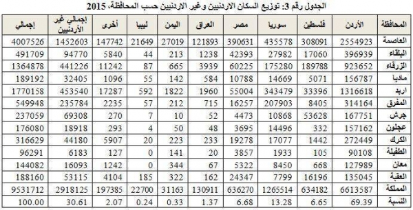 وفيما يتعلق بتوزيع السكان في المحافظات حسب الجنسيات في المملكة، يشكل السكان غير الاردنيين حوالي 30 بالمائة من اجمالي السكان، نصفهم (3ر1 مليون) من السوريين، يتركز نسبة كبيرة منهم (436 ألفا) في محافظة العاصمة، ثم إربد 343 الفا، ثم المفرق 208 آلاف فالزرقاء 175 ألفا.