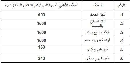 وقالت ان اسعار الخبز العربي الكبير محددة كما هو معروف بـ 16 قرشا والخبر العربي الصغير بـ 24 قرشا للكيلو.