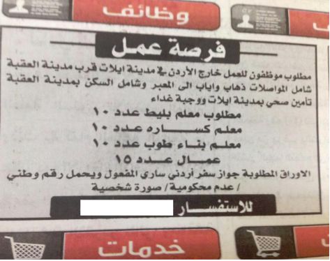 وتالياً نص الإعلان: "مطلوب موظفون للعمل خارج الأردن في مدينة إيلات قرب مدينة العقبة شامل المواصلات ذهاب وإياب إلى المعبر وشامل السكن بمدينة العقبة، تأمين صحي بمدينة إيلات ووجبة غداء:
