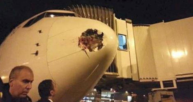 ارتطم طائر عملاق بطائرة مصر للطيران المتجهة إلى مطار هيثرو في لندن، وتسبب بإحداث ثقب كبير بجسم الطائرة دون أي خسائر في الأرواح.