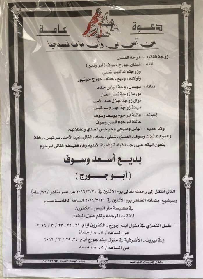 وأصيب والد وسوف مؤخرا بأزمة صحية أدخلته في غيبوبة حتى وافته المنية صباح اليوم. وكان جورج وسوف سافر إلى والده للاطمئنان عليه ببلدة كفرون السورية.