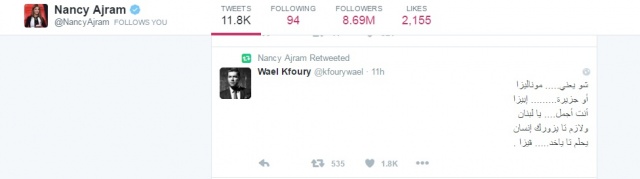 حققّت تغريدة للنجم اللبناني وائل كفوري مئات الإعجابات وإعادة النشر، فيما اعتبرها كثيرون رداً غير مباشر على النجمة الإماراتية أحلام، وافقته عليه النجمة اللبنانية نانسي عجرم.