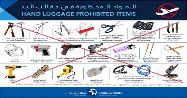 استعرضت قائمة نشرتها مؤسسة مطارات دبي على حسابها في موقع “تويتر"، المواد المحظورة في حقائب اليد عند السفر عبر مطارات الإمارة، حفاظاً على سلامة الركاب ولأسباب أمنية.