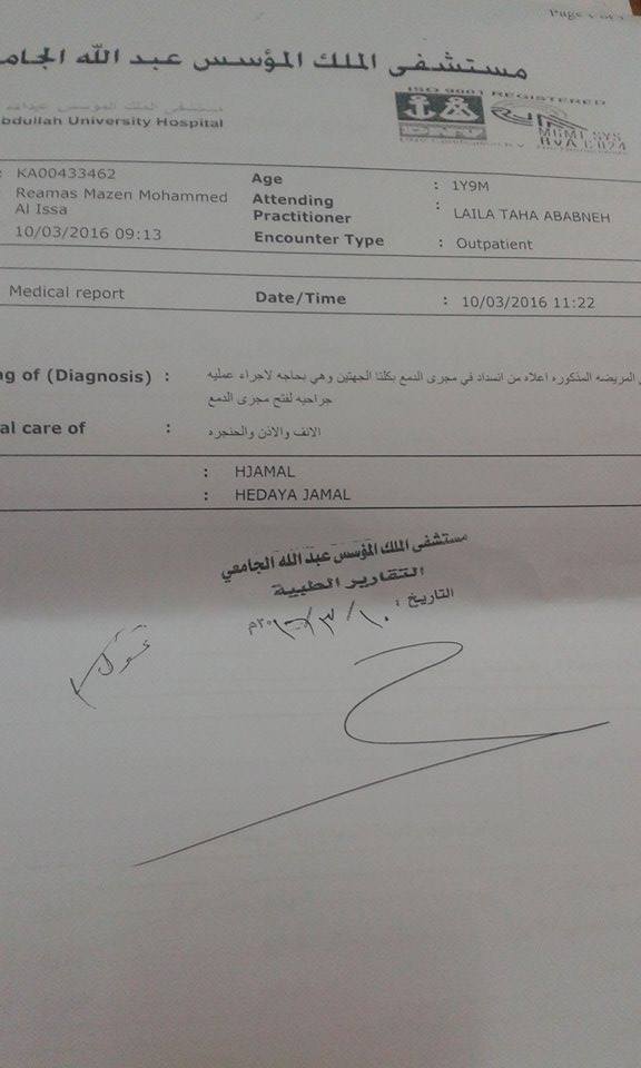 وأشار محدثنا إلى أن طفلته ريماس التي لم تكمل العام ونصف أصيبت بانسداد في مجرى العين، وهي قيد العلاج والمتابعة الآن، أما دانا 4 سنوات –كما يقول محدثنا- فتعاني من سوائل خلف طبلة الأذن، وتابع الدلكي أن الأطباء "أجروا لها عملية لمجرى الدمع في مستشفى الملك المؤسس، وهي تحتاج الآن إلى عملية لإزالة السوائل خلف طبلة الأذن لأنها دائمة الصراخ من الألم. وإذا استمرت السوائل فهذا سيؤدي إلى التقليل من سمعها -كما أكد الأطباء- وتعاني جنى 6 سنوات من الجيوب الأنفية وألم دائم في الرأس.