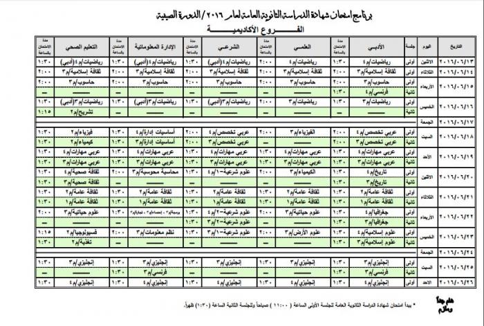 واضاف أنّ برنامج امتحان شهادة الدراسة الثانوية العامة، سيبدأ في الثالث عشر من 13/6/2016 وينتهي في 26/6/2016، مشيراَ إلى أن الجلسة الأولى من الامتحان ستبدأ الساعة الحادية عشرة صباحاً، والجلسة الثانية تبدأ في تمام الساعة الواحدة والنصف ظهراً.