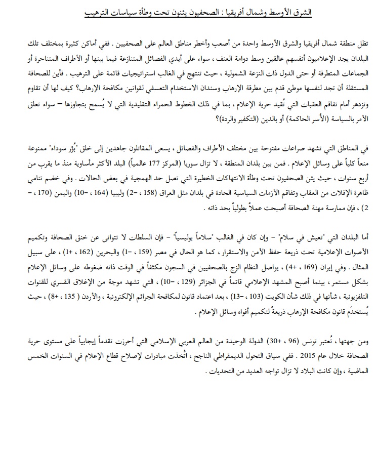وجاءت آسيا في المرتبة الثالثة، بينما أوروبا الشرقية وآسيا الوسطى في الرابعة، أما شمال أفريقيا والشرق الأوسط فتبقى المنطقة التي يعاني صحفيوها ضغوطاً بمختلف الأنواع والأشكال.