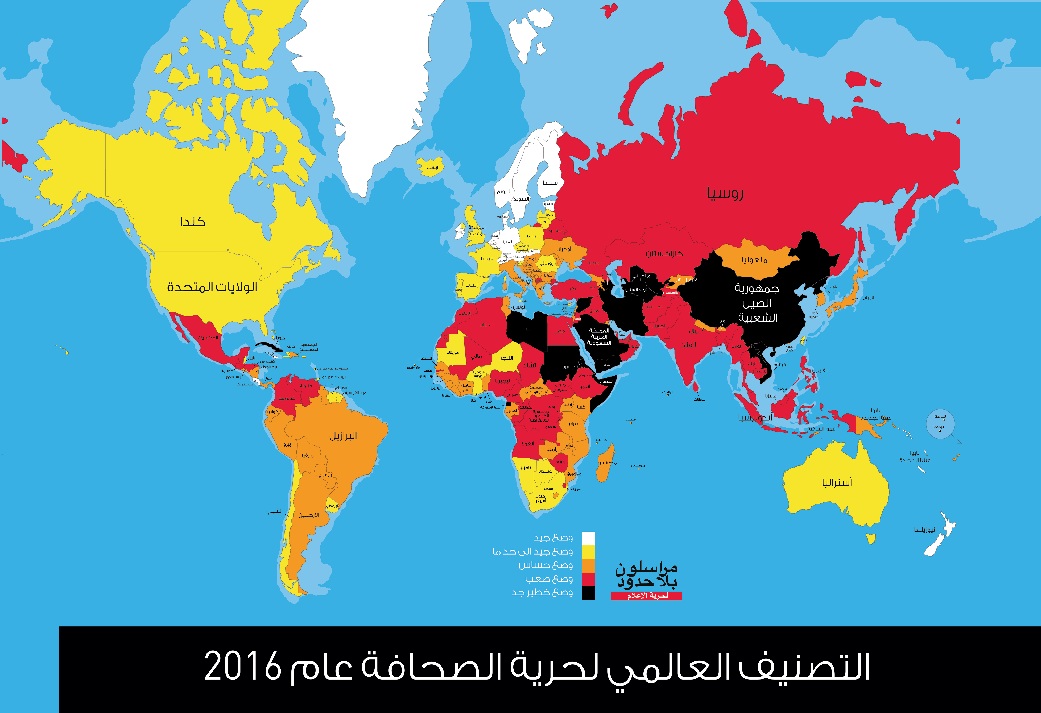 ويبرز التصنيف الاتجاه العام مناخاً يعمُّه الخوف والتوتر على نطاق واسع، إضافة إلى حالة تعكس وقوع المؤسسات الإعلامية في أيدي بعض الدول والمصالح الخاصة على نحو متزايد.