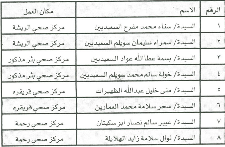 دعت وزارة الصحة بالتنسيق مع ديوان الخدمة المدنية التالية أسماؤهم مراجعة مبناها في طبربور لاستكمال اجراءات التعيين مصطحبين معهم الوثائق الثبوتية اللازمة خلال 10 أيام من تاريخه .والمدعوون هم :