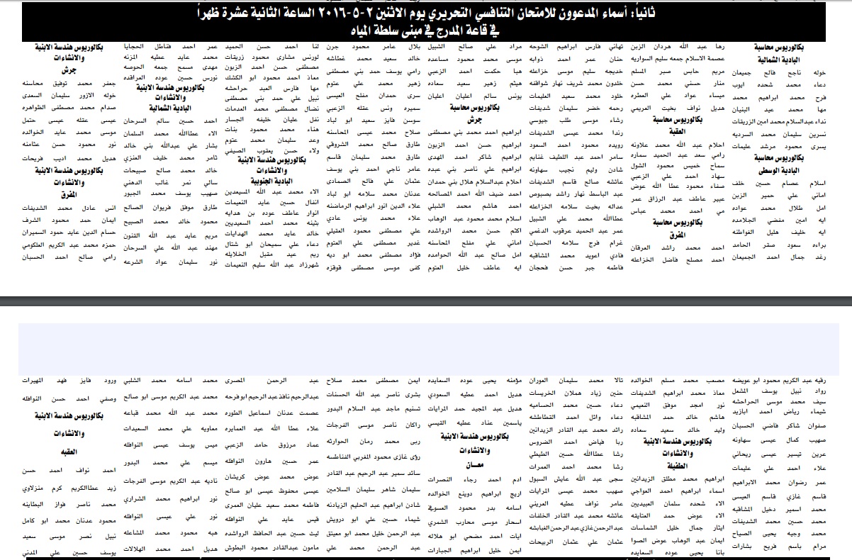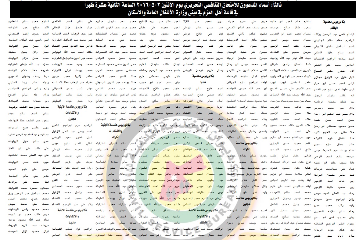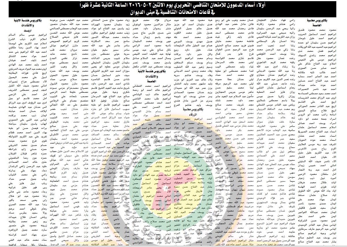 سلطة وادي الأردن ، الضمان الاجتماعي ، تنمية أموال الأيتام ، ضريبة الدخل والمبيعات ، قاضي القضاة ، الشؤون الفلسطينية ، تنظيم النقل البري ، بنك تنمية المدن والقرى ، الخط الحديد الحجازي ، المجلس الأعلى لشؤون الأشخاص المعوقين ، التالية أسماؤهم مراجعته بتاريخ 2-5-2015 في المواعيد والأماكن المبينة ازاء اسم كل منهم لتقديم الامتحان التنافسي لغايات التعيين .