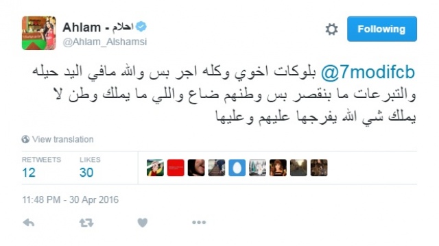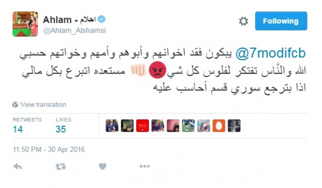 عربت الفنّانة الإماراتية أحلام عن عميق حزنها لما يجري في مدينة حلب تحديداً وسورية عموماً، مؤكدة أنها على استعداد للتبرع بكل ما تملك إذا كانت الأموال تعيد سورياً واحداً.