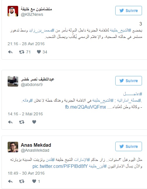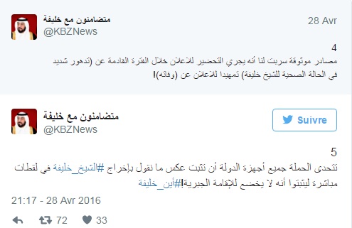 وأضافت: "مصادر موثوقة سربت لنا أنه يجري التحضير للإعلان خلال الفترة القادمة عن (تدهور شديد في الحالة الصحية للشيخ خليفة) تمهيدا للإعلان عن (وفاته)!".
