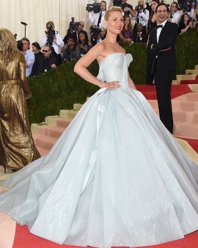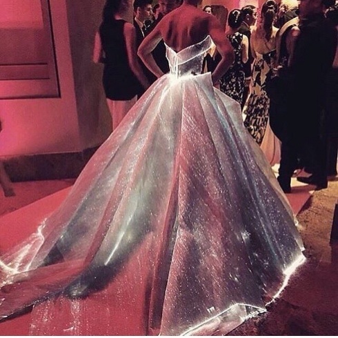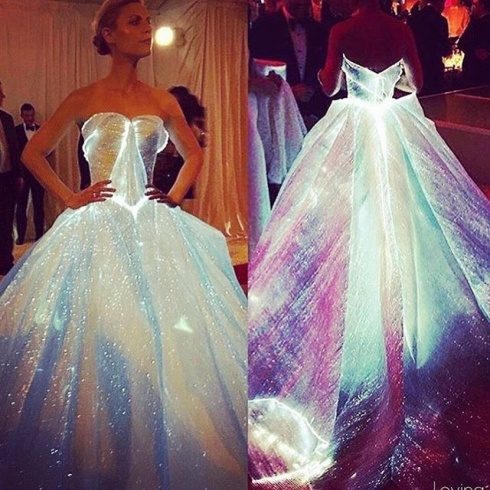 أضاءت الممثلة الأميركية Claire Danes سجادة حفل الـ Met Gala بفستان أميرة ديزني سندريلا بتوقيع المصمم Zac Posen الذي جمع بين الموضة والتكنولوجيا إذ اعتمدت به خامة الأورغانزا وأضاءها بالألياف البصرية المضيئة، فتحولت Danes الى أميرةً تشع نوراً بهذا التصميم المعاصر.