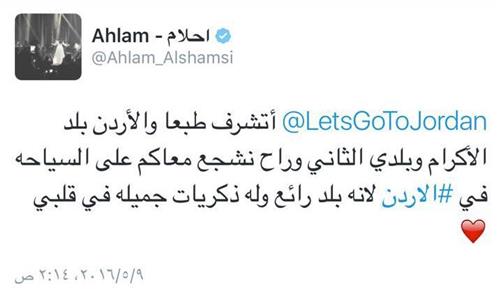 اعلنت الفنانة الاماراتية احلام عن دعمها للاردن سياحيا من خلال حسابها يلا على الأردن وهاشتاغ #صيف_الأردن_أحلى.وقالت احلام في تغريدة لها "الاردن بلد الاكرام وبلدي الثاني ولي فيه ذكريات جميلة على قلبي".