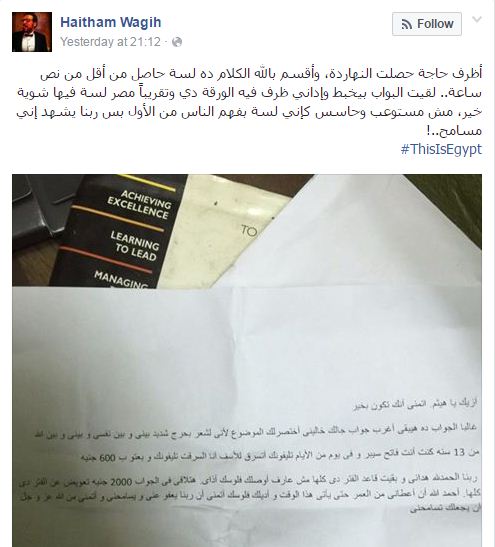 وجاء الجُزء الأخر من الجواب، مُعبرًا عن اعتذار الشخص الذي قام بسرقة الهاتف: "أنا الحمد لله ربنا هداني، هتلاقي في الجواب 2000 جنية، تعويض عن الفترة دي كُلها، أحمد الله أن أعطاني من العمر حتى يأتي هذا الوقت، واديلك فلوسك، واتمنى من ربنا يسامحني ويجعلك تسامحني".