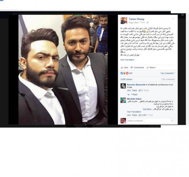 تامر حسني نشر الصورة على صفحته الرسمية على فيس بوك، وعلّق قائلاً: "للوهلة الأولى كنت رايح أسلم عليه كنت فاكره أنا لأ وتحس أنه شبهي أكتر مني مش فاهم ازاي المهم بعد ما أتكلمت معاه لقيت الموضوع كله أن من الحب ما شبه بس اللي خلاني اكتب البوست ده حاجه مهمة أوي إني سألته بتشتغل إيه قالي مهندس ففرحت عشان انك تكون بتحب فنان ومستهويك حته انك شبهه أوعى تلغي نفسك وتعيش على الفكرة دي هزر بيها كام يوم كده وخلاص إنما أنت لازم تبقى أنت واللي هكون فرحان بيه بجد انك لو بتحب فنان أوي كده فيا ريت تتأثر بالأعمق بالمضمون مش الشكل أتأثر بنجاحه واتعب وانجح زيه في مجالك".