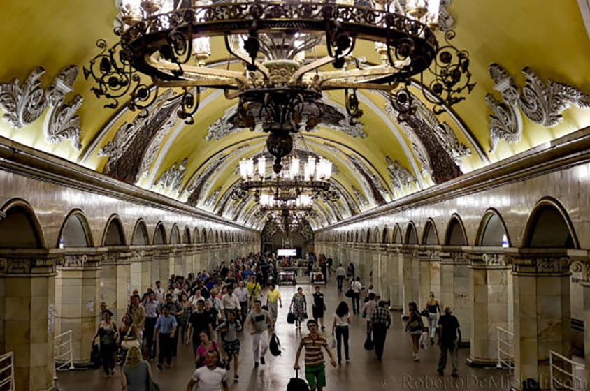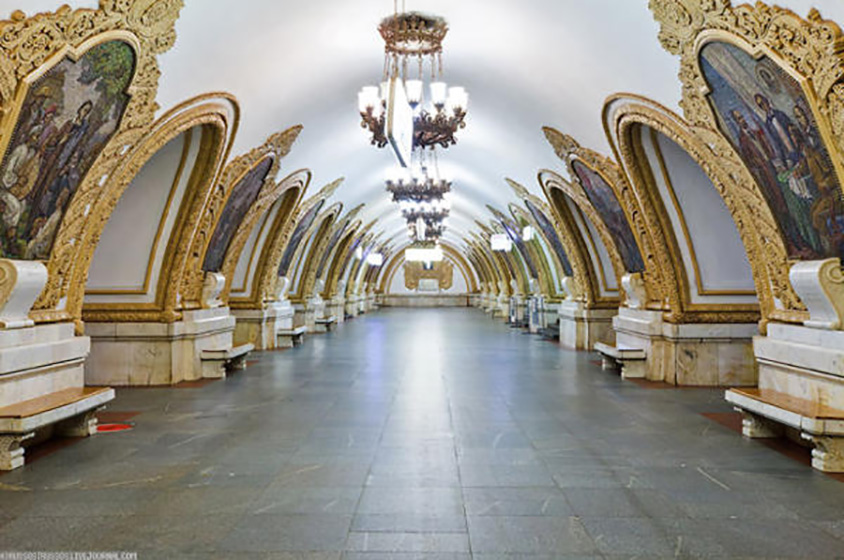 دعائم هذه المحطة فسيفسائية وتتناثر على جدرانها الأحرف الروسية والعلم الأحمر والمطرقة والمنجل.