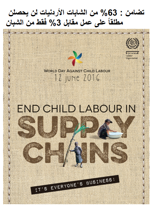 وأكد التقرير العالمي حول عمالة الأطفال لعام (2015) الى أن 11.5% من الشباب والشابات الأردنيين وأعمارهم ما بين 15-24 عاماً والذين عملوا وهم أطفال معرضين بأن يعملوا لدى عائلاتهم بدون أجر، مقابل 2.5% من الشباب والشابات الذين لم يعملوا في طفولتهم.