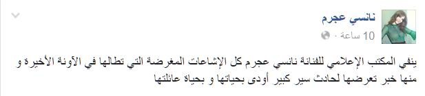البيان الصادر عن المكتب الاعلامي لنانسي نشر عبر كل حساباتها الموثقة بمواقع التواصل الاجتماعي، وجاء فيه: ينفي المكتب الإعلامي للفنانة نانسي عجرم كل الإشاعات المغرضة التي تطالها في الآونة الأخيرة و منها خبر تعرضها لحادث سير كبير أودى بحياتها و بحياة عائلتها.
