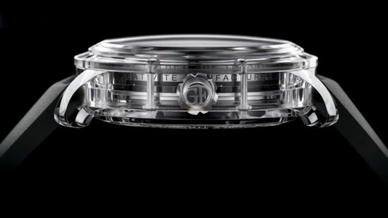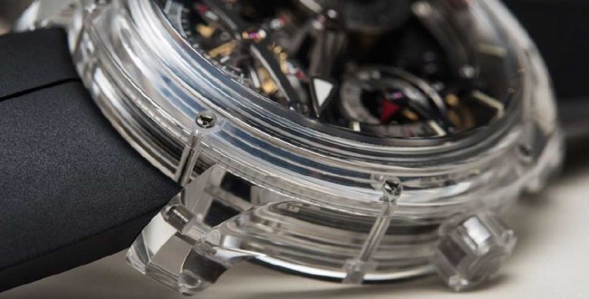وتمتاز الساعة، التي أنتجتها الشركة السويسرية المتخصصة في صناعة الساعات الأكثر تعقيداً في العالم، بأنها تأتي بهيكل شفاف تماما مصنوع من زجاج «Sapphire».