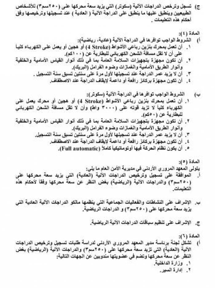 واشترطت التعليمات الجديدة أن يتم مقدم طلب تسجيل وترخيص دراجة آلية رياضية سن 25 عاما شمسية من عمره وأن يكون حاصلا على موافقة وزير الداخلية.
