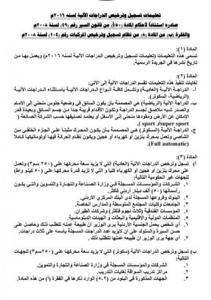 منعت التعليمات الجديدة تسجيل وترخيص الدراجات الآلية لسنة 2016 مسير الدراجات الآلية على الطريق العام بشكل مواكب إلا بعد اخذ الموافقات الأمنية وبالتنسيق مع المعهد المروري.