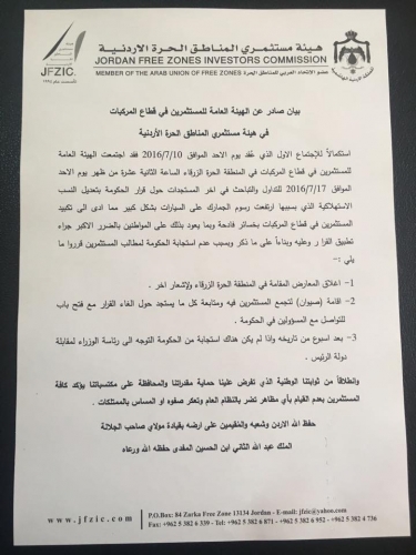 وأكد محمد البستنجي رئيس هيئة مسثمري المواقع الحرة الأردنية، أنه يحتشد في هذه الأثناء عدد من التجار في منطقة الحرة للاحتجاج على قرارات الحكومة الجائرة بحقهم في الآونة الأخيرة .