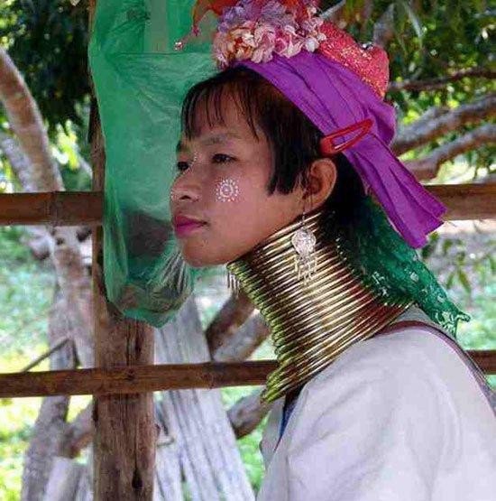 -2 الرقبة الطويلة في قبيلة كايان في تايلاند: تعتبر الرقبة الطويلة من مميزات الجمال في قبيلة كايان التايلاندية، حيث يتم إلباس الفتيات من عمر خمس سنوات حلقات معدنيَّة حول رقابهنَّ وزيادة العدد تدريجياً مع مرور السنوات للوصول إلى الرقبة الطويلة التي تعتبر أيضاً من معايير الأناقة.