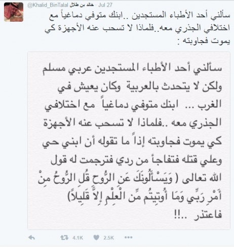 وغرّد الأمير عبر حسابه الخاصّ على "تويتر" وكتب: "سألني أحد الأطباء المستجدين عربي مسلم ولكن لا يتحدّث بالعربية وكان يعيش في الغرب... ابنك متوفي دماغياً مع اختلافي الجذري معه.. فلماذا لا تسحب عنه الأجهزة كي يموت فجاوبته اذاً ما تقوله أن ابتي حي وعلي قتله فتفاجأ من ردي".