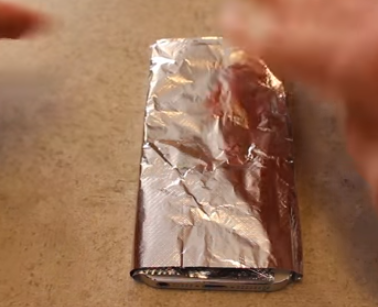 احضر ورق الالمونيوم و قم بتغليف هاتفك به ما عدا الجهة العلوية و السفلية مثلما في الصورة.