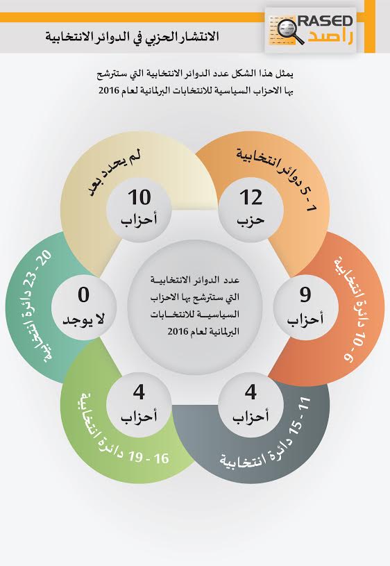 وبخصوص الانتشار الحزبي في الدوائر الانتخابية، فقد تبين أن 12 حزبا سيترشح ضمن 5 دوائر انتخابية كحد أعلى، فيما ستترشح 9 أحزاب ضمن 6 إلى 10 دوائر انتخابية كحد أعلى، بينما ستترشح 4 أحزاب في 11 إلى 15 دائرة انتخابية ولم تحدد 10 أحزاب بعد عدد الدوائر التي سيترشح بها.