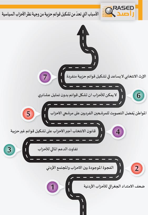ووفقا للدراسة، فإن الأسباب التي تحد من تشكيل قوائم حزبية من أعضاء الحزب فقط تتمثل في ضعف الامتداد الجغرافي للأحزاب الأردنية، كما أن قانون الانتخاب أجبر الأحزاب على تشكيل قوائم غير حزبية، كذلك لا يمكن للأحزاب أن تشكل قوائم بدون تمثيل عشائري، وأن المواطن يُفضل التصويت للمرشحين الفرديين على مرشحي الأحزاب، إضافة إلى أن الإرث الانتخابي لا يساعد في تشكيل قوائم حزبية منفردة.