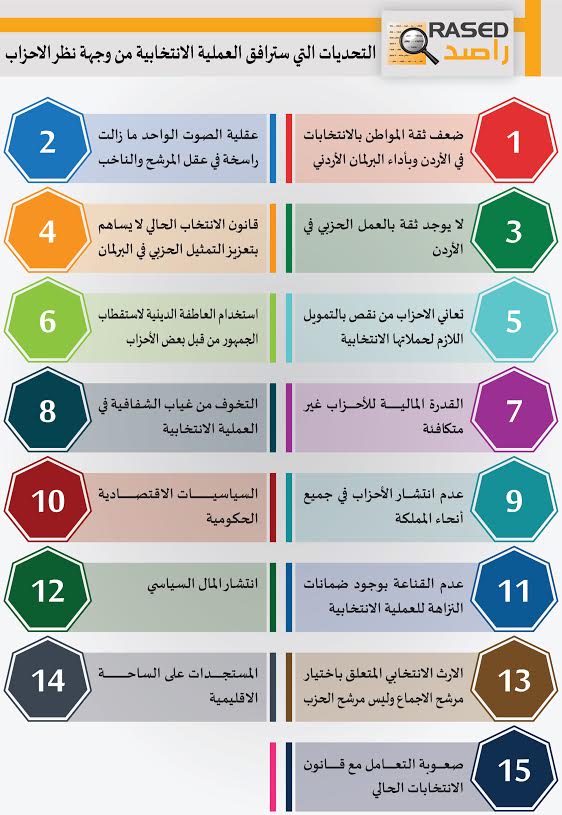 أما فيما يخص التحديات التي سترافق العملية الانتخابية من وجهة نظر الأحزاب، فقد أورد الأحزاب 16 تحديا أو تخوفا منها أن عقلية الصوت الواحد ما زالت راسخة في عقل المرشح والناخب، وأن قانون الأحزاب الحالي يعدّ تحدياً للعمل الحزبي، وعدم وجود ضمانات النزاهة للعملية الانتخابية، كذلك انتشار المال السياسي، كما أن القدرة المالية للأحزاب غير متكافئة، واستخدام العاطفة الدينية لاستقطاب الجمهور، إضافة إلى ضعف ثقة المواطن بالانتخابات في الأردن وبأداء البرلمان الأردني.