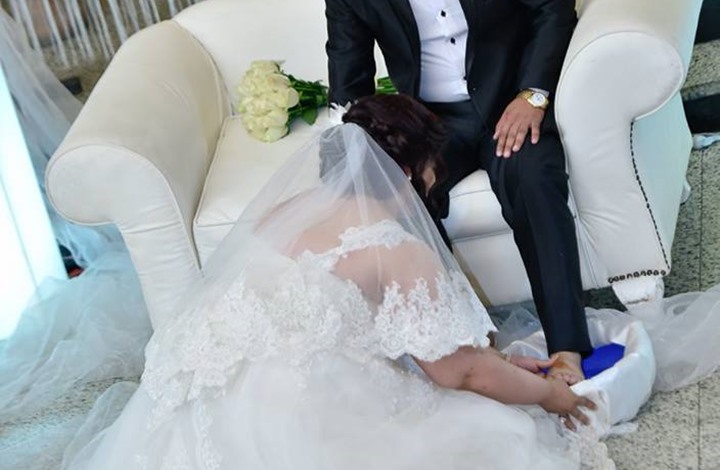 عروس بكامل زينتها تغسل قدمي زوجها - صور