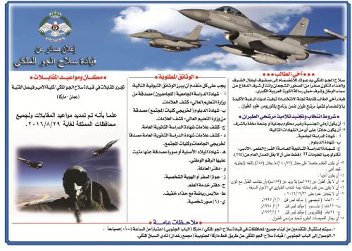 أعلنت قيادة سلاح الجو الملكي تمديد موعد المقابلات الشخصية لمرشحي الطيران لبرنامج بكالوريوس علوم الطيران وبكالوريوس المراقبة والملاحة الجوية لغاية 29/8/2016 ولجميع محافظات المملكة .