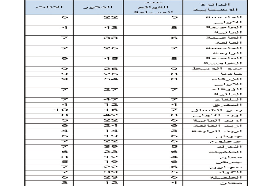 وكان المومني اعلن عدد طلبات الترشح في الدوائر الانتخابية المختلفة لغاية الساعة الحادية عشرة ظهرا على النحو التالي: