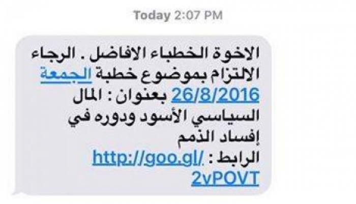 وكتب في الرسالة: 'الأخوة الخطباء الأفاضل: الرجاء الالتزام بموضوع خطبة الجمعة 26/8/2016 بعنوان: المال السياسي الأسود ودوره في إفساد الذمم'.