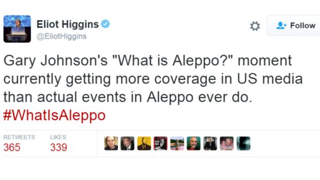 واشتعل تويتر على إثر ما قاله جونسون، ودشن المستخدمون هاشتاغ #WhatIsAleppo أو "ما هي حلب؟" لينتشر بصورة كبيرة ويظهر في قائمة أكثر الهاشتاغات تداولا في الولايات المتحدة لفترة قصيرة.