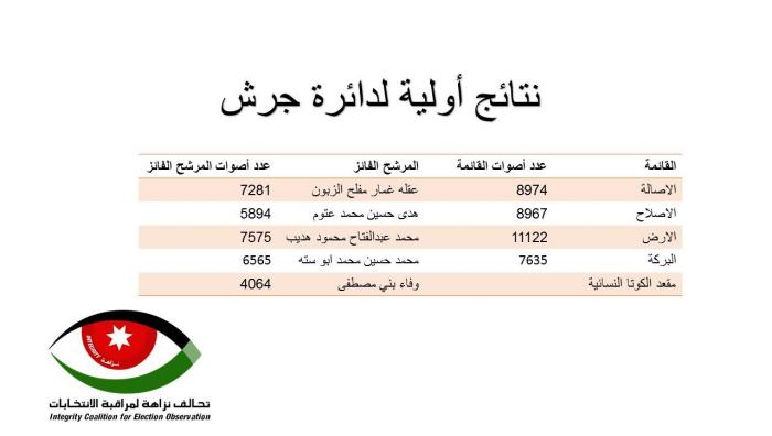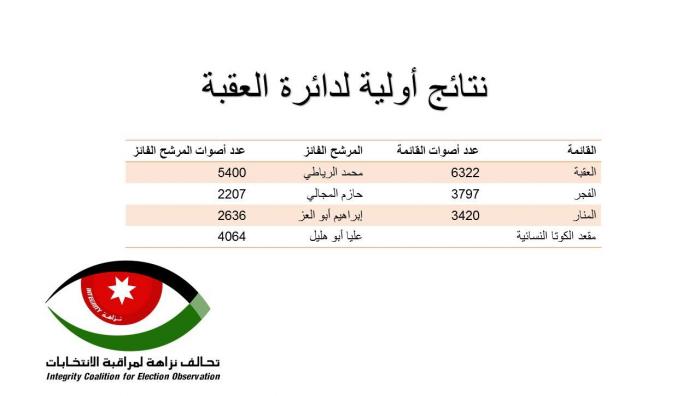 وفيما يلي النتائج الاولية في محافظات: العقبة وجرش وبدو الجنوب، مع الاشارة إلى أن الهيئة الستقلة ستعلن في مؤمر صحفي ظهر اليوم نتائج الانتخابات: