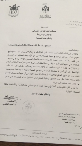 قررت محكمة أمن الدولة، حظر النشر في قضية مقتل الكاتب الصحفي ناهض حتر، سواء عن طريق المواقع الإلكترونية أو وسائل التواصل الاجتماعي.