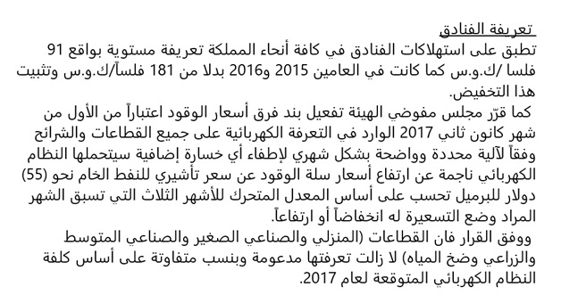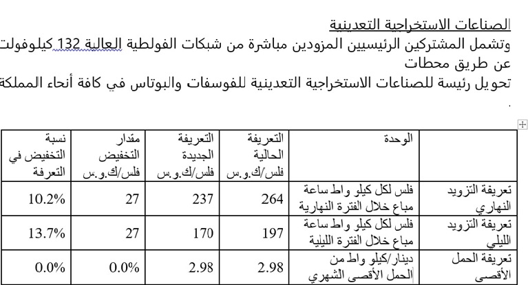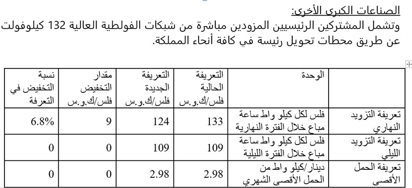 وقال رئيس مجلس المفوضين/ الرئيس التنفيذي للهيئة المهندس فاروق الحياري في تصريح صحفي اليوم الاربعاء، ان القرار الذي اتخذه المجلس في جلسة عقدت امس الثلاثاء يأتي في ضوء الدراسات التي أعدّتها هيئة تنظيم قطاع الطاقة والمعادن حول التعرفة الكهربائية وكلف النظام الكهربائي والإيرادات المتوقعة من القطاعات المختلفة ومقدار الدعم المقدّم من بعض القطاعات الداعمة للقطاعات الأخرى المدعومة، والتي تم عرضها وبحثها في مجلس الوزراء، واصدر بخصوصها توجيهاته في جلسة المجلس التي عقدت يوم الاثنين الماضي بتخفيض التعرفة الكهربائية على غالبية القطاعات الاستثمارية والصناعية والخدماتية ذات التعرفة الكهربائية المرتفعة.