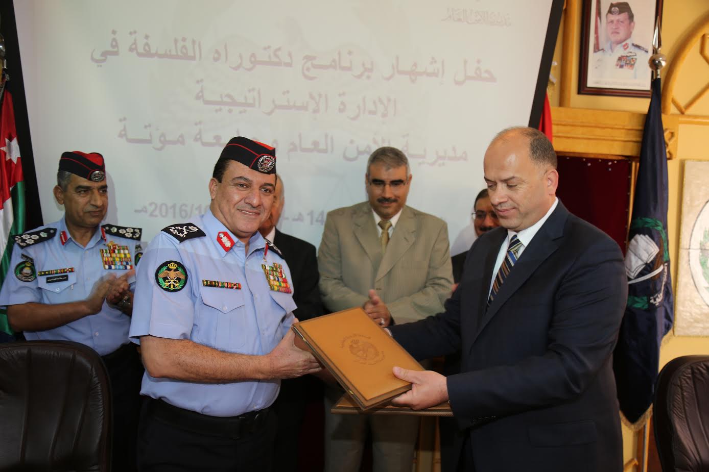 احتفل في اكاديمية الشرطة الملكية اليوم بتوقيع بروتوكول إشهار برنامج شهادة الدكتوراه بين جامعة مؤتة ومديرية الامن العام وذلك بحضور مدير الأمن العام اللواء عاطف السعودي ورئيس الجامعة الأستاذ الدكتور ظافر يوسف الصرايرة .