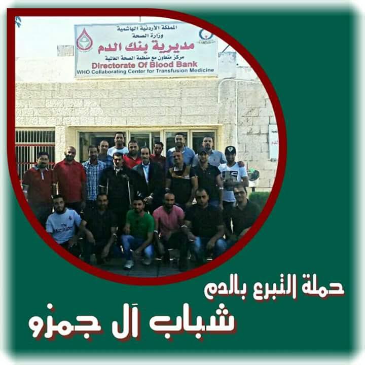 بمبادرة إنسانية من شباب آل جمزو وتأكيداً منهم على حرصهم لاستمرارية هذا الواجب الوطني بين أبناء بلدنا الحبيب الاردن وحرصاً منهم في رفع إسم العمل الخيري عالياً قام شباب آل جمزو وتحت رعاية جمعية جمزو الخيرية ممثلة برئيسها الأستاذ يوسف كنعان المحترم والأستاذ حسن الخطيب رئيس ديوان أهالي جمزو وعضو لجنة الديوان السيد ياسر عساف التبرع بالدم صباح يوم الجمعة الموافق 7/10/2016 مؤكدين حرصهم على العمل الجماعي لخدمة ابناء بلدنا الحبيب الاردن في ظل قيادة جلالة الملك عبدالله الثاني بن الحسين حفظه الله..