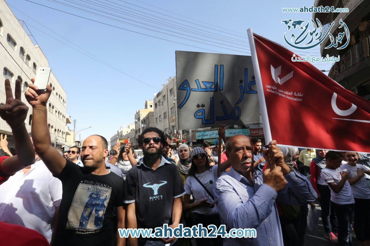 ورفع المشاركون في المسيرة التي رفعت فيها الاعلام الاردنية ، شعارات ويافطات مناهضة لاتفاقية شركة الكهرباء الوطنية مع شركة "نوبل انيرجي" الاميركية لاستيراد الغاز من اسرائيل، مطالبين الحكومة بإلغاء الإتفاقية والبحث عن خيارات أخرى .