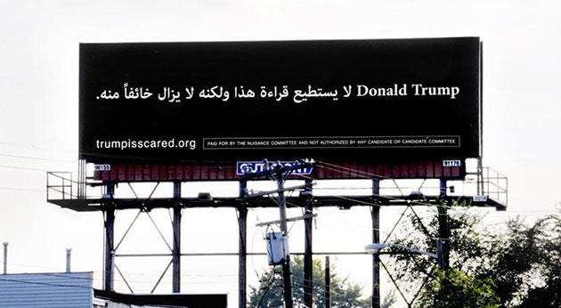 في بادرة غير مسبوقة، نشرت حملة أميركية لافتة باللغة العربية على الطريق السريع لولاية ميشغان، لأجل التهكم على المرشح الجمهوري للرئاسة الأميركية، دونالد ترامب.