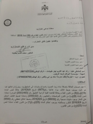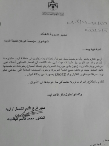 وحذرت المؤسسة من تداول زيت زيتون مغشوش في الأسواق المحلية معبىء تحت الإسم التجاري (كنانه) – تعبئة مؤسسة البركان لزيت الزيتون، حيث ذبطت كوادر المؤسسة معمل لتجزئة وتعبئة زيت زيتون في منطقة البارحة- اربد بتاريخ 5/10/ 2016 حيث تبين ان المعمل المذكور غير مرخص ويقوم بخلط زيت زيتون بلدي مع زيت الصويا واضافه اصباغ لتعطي لون زيت الزيتون الاصيل.